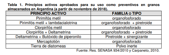 - 3. Pre-limpiar el grano y descorazonar el silo El material fino que acompaña al grano (granos partidos, restos vegetales, semillas de malezas, tierra, etc.) se deposita en una columna central durante el llenado del silo, formando un corazón compacto que dificulta el pasaje del aire durante la aireación. Pre-limpiar el grano antes de llenar los silos reduce la cantidad de material fino y, por lo tanto, mejora la eficiencia de la aireación. El descorazonado del silo, que consiste en descargar un 3% del silo aproximadamente luego del llenado, tiene la misma utilidad: eliminar el corazón de finos y mejorar la circulación del aire. 1.4. Aplicar insecticidas preventivos en el grano Si se prevé una presión de insectos importante (almacenamiento por tiempo prologando o clima muy caluroso) a las medidas anteriores puede sumarse la aplicación de un insecticida líquido residual directamente sobre la mercadería. Debido al poder residual, el efecto protector del insecticida se extiende en el tiempo. Estos tratamientos se realizan con el grano en movimiento (durante la carga del silo o un trasilado) y se emplean los mismos principios activos que para las instalaciones vacías, aunque naturalmente difieren las dosis y la metodología de aplicación. En Argentina, los principios activos aprobados por el SENASA para su uso como preventivos en granos almacenados pertenecen a las familias de los 3 organofosforados y piretroides (Tabla 1). Es importante destacar que, si la mercadería que ingresa a la planta posee una infestación evidente o bien se sospecha una infestación oculta, la aplicación de un insecticida preventivo puede no ser eficaz para controlar la infestación y debe evaluarse la necesidad de realizar una fumigación con fosfina.