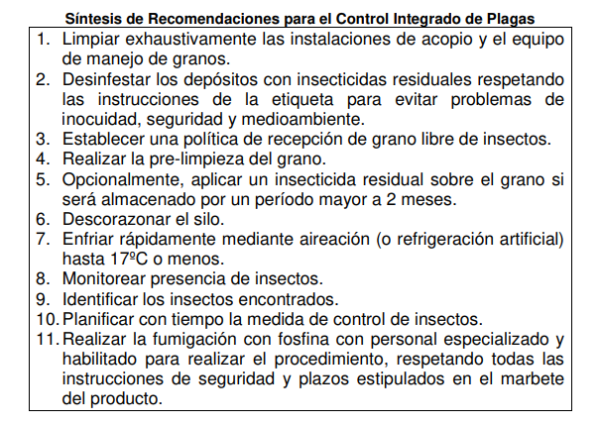 - Herramientas de prevención Los esquemas de Control Integrado de Plagas para granos almacenados hacen énfasis en las medidas de prevención. En la medida en que las plagas no aparezcan, tampoco aparecerán sus efectos indeseables (daños directos sobre el grano, rechazos por insectos vivos, aumento de costos por necesidad de aplicar insecticidas, rechazos por residuos de insecticidas, eventuales intoxicaciones y derrames de insecticidas, etc.).