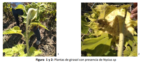 Nysius sp, es una chinche muy pequeña que se la conoce en nuestro país como “chinche diminuta” o “chinche de las semillas”. Este hemíptero pertenece a la familia Lygaeidae. En la presente campaña de girasol se observó presencia de chinche diminuta en los girasoles de estado avanzado, desde fines de noviembre en adelante. (Figura 1-2) El Ing. Agr. Nicolás Iannone, en el año 2011, la informo como nueva plaga en girasol, generalmente presente sobre el cultivo desde antes de botón floral y hasta la floración e incluso formación de aquenios, en distintas zonas del país.