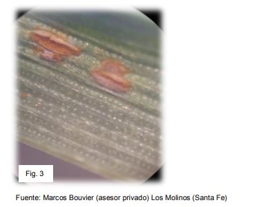 La recomendación es comenzar o seguir con los monitoreos de los lotes sembrados con variedades susceptibles con el objetivo de conocer si hay establecimiento de la enfermedad y de estar presente, en que magnitud. Los monitoreos deben hacerse con cierta periodicidad una vez detectada la enfermedad. Se sugiere en estado de macollaje, recorrer los lotes cada 7 días y acortarlo en caso de que el cultivo se encuentre en estadios de encañado. Debemos asegurarnos que la evaluación sea representativa del estado de la enfermedad para lo cual se recomienda recorridos en zig- zag o en diagonales muestreando y evaluando el cultivo en al menos 20 estaciones de muestreo. Es conveniente aclarar que roya de la hoja presenta una distribución homogénea en el lote, aunque puede registrarse mayor infección en algunos sectores donde el cultivo puede presentar crecimiento distinto como por ejemplo cabeceras con presencia de plantas más estresadas. En cada estación de muestreo se tomará una planta y se observarán todas las hojas desplegadas del tallo principal (por lo general éste se identifica por ser el de mayor crecimiento en comparación con el resto de los macollos). Con esto se podrá conocer los niveles de infección medidos en términos de incidencia y severidad. La incidencia se define como un valor porcentual de la enfermedad dado por la relación entre el número de hojas con enfermas (1) / número total de hojas observadas * 100 (1) hojas con al menos 1 pústula visible La severidad en cambio, es un valor porcentual del área foliar fotosintéticamente activa afectada por la enfermedad resultante de la sumatoria de porcentajes de área foliar afectada en cada hoja / número de hojas observadas * 100.