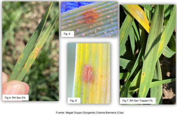 Las figuras 3, 5 y 6 muestran pústulas de tipo “S” susceptibles, de mayor tamaño, esporulantes y sin halo clorótico. Las figuras 1, 2, 4 y 7 muestran distintos niveles de severidad.