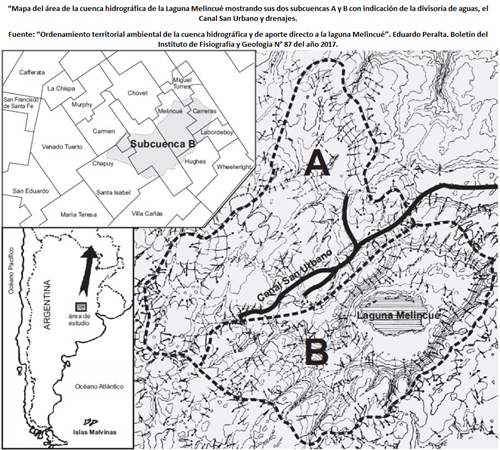 Otra de las cuencas en la provincia de Santa Fe que sufre los embates de los excesos hídricos es la Laguna de Melincué. Hemos procedido a analizar y transcribir un importante trabajo titulado “Ordenamiento territorial ambiental de la cuenca hidrográfica y de aporte directo a la laguna Melincué” del especialista Eduardo Peralta, el cual ha sido publicado en el Boletín del Instituto de Fisiografía y Geología N° 87 del año 2017.