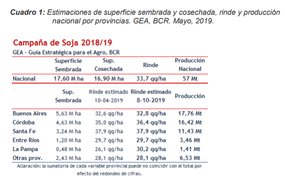 El 35% de la soja argentina saldrá de la región núcleo aportando 20 M tn, con un promedio de 40 qq/ha. Se observó un incremento en la participación de las siembras de segunda que pasó de un 25% a un 36%. Se destacaron los rendimientos en las localidades de Marcos Juárez, Corral de Bustos, Isla Verde, Monte Maíz, Laborde, Monte Buey e Inriville, entre otras localidades con promedios de 45 qq/ha para soja de primera y 42 qq/ha para soja de segunda, con muchos lotes que marcaron topes de hasta 60 qq/ha. El sudeste de Buenos Aires presentó algunos excesos hídricos que limitaron la expresión de los rendimientos, sobre todo en la soja de segunda donde los mismos fueron dispares (GEA 9/5/19). En el cuadro 1 se muestran los datos estimados para cada provincia.