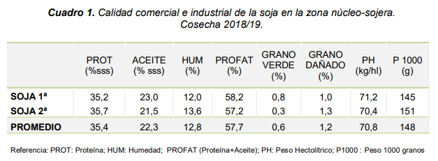 La campaña sojera 2018/19 presentó en general buenas condiciones climáticas en la región central del país. En el cuadro 1 se presentan los promedios de los principales parámetros de calidad comercial e industrial de soja de 1ª, 2ª siembra y promedio general del relevamiento en acopios y cooperativas en la zona núcleo.