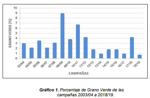 De acuerdo a la Norma XVII de comercialización de soja Nº 151/2008, la base de comercialización para grano verde es del 5% y se rebajará a razón de 0,2% por cada porciento o fracción proporcional, con una tolerancia de recibo del 10% para grano verde. Con respecto a este rubro la totalidad de las muestras analizadas tuvieron valores inferiores a la base de recibo, no presentando inconvenientes durante esta campaña. El promedio de la recorrida arrojó un valor de 0,6%. Se debe tener en cuenta que la presencia de altos porcentajes de grano verde es un aspecto indeseado para la industria ya que ocasiona problemas en el procesamiento del poroto, debiendo utilizar filtros especiales, disminuyendo la eficiencia del proceso. En el gráfico 1 se presentan los porcentajes de grano verde de la campaña 2003/04 a 2018/19.