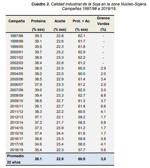 El PROFAT (sumatoria de Proteína+Aceite), en esta cosecha fue para soja de 1ª de 58,2% (58,1% campaña 17/18) y para soja de 2ª de 57,2% (57,8% la campaña 17/18), con un promedio para el año de 57,7% (58,0% campaña anterior), inferior en 3,2% al promedio de 22 años que fue de 60,9%.