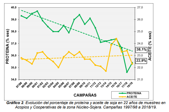 El promedio general del porcentaje de aceite se ubicó en 22,3% sss, un 1,1% inferior a la cosecha pasada, siendo 0,6% inferior al promedio de 22 años. El ambiente cumple un rol fundamental en la expresión de la cantidad y calidad del aceite y proteína de la soja. La temperatura tiene mayor efecto sobre el porcentaje de aceite (Piper et al. 1999; Cuniberti y Herrero, 2006). A mayor temperatura es esperable aumentos en el porcentaje de aceite durante el llenado de grano, siendo el óptimo entre 25-28ºC (Dardanelli et al., 2006). En zonas de menor latitud, donde el llenado del grano coincide con elevadas temperaturas, se tiene mayor cantidad de aceite con mejor calidad, ya que en su composición se encuentra un porcentaje mayor de ácido oleico y menor de linolénico. Este último no deseado por la industria ya que le da mayor inestabilidad a los aceites. Esta campaña según informe Andreucci y Aimetta 2019, se presentó con temperaturas máximas promedio inferiores al histórico que pueden haber influido en el menor % de aceite.