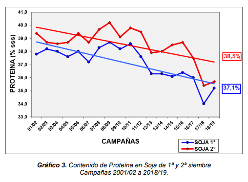 - El promedio de proteína en soja de 1ª fue de 35,2% y la soja de 2ª fue de 35,7% con una diferencia entre ambas de 0,5%, bastante inferior a la diferencia obtenida en promedio de 18 años que fue de 1,4%.