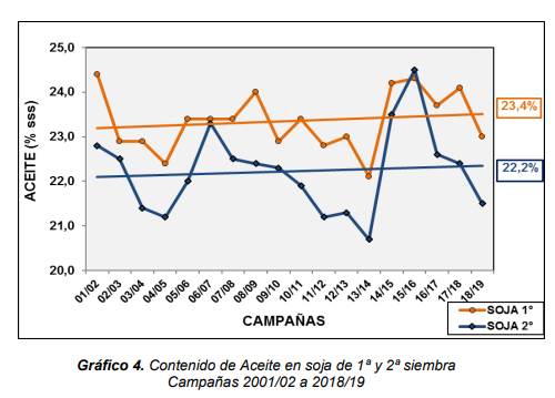 En la presente campaña, en soja de 1ª el contenido de aceite promedio fue de 23,0%, y en soja de 2ª fue de 21,5%. En el Gráfico 4 se observa el comportamiento del porcentaje de aceite para soja de 1ª y 2ª siembra. La línea de tendencia de soja de 1ª se ubica en promedio un 1,2% por encima de soja de 2ª.