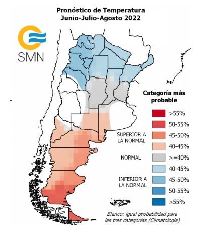 Además, en Córdoba y el sur del Litoral podemos esperar un trimestre junio-julio-agosto 2022 con una mayor probabilidad de temperaturas dentro del promedio para la época.