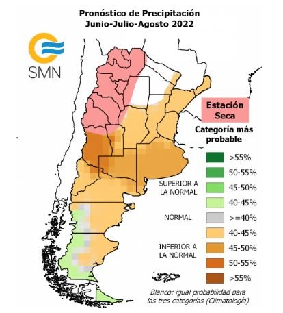 En el trimestre junio-julio-agosto 2022 hay una mayor probabilidad de lluvias por debajo de lo normal en el sur de Cuyo, La Pampa y Buenos Aires. En cambio, se pueden esperar lluvias normales o inferiores a lo normales sobre el Litoral, Córdoba y el norte y este de Patagonia.