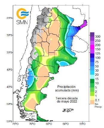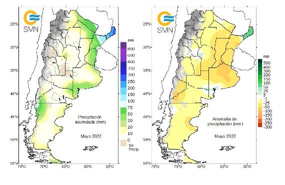 - En general, mayo fue un mes con precipitaciones escasas en gran parte del país. En buena parte del este de Cuyo, Córdoba, oeste de Formosa y este de Salta ya se observan condiciones de sequía entre leve y moderada.