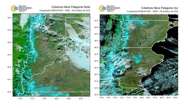 - A continuación podemos observar en la imagen satelital la cobertura de nieve (tonalidades celeste claro) al 26 de mayo en zonas cordilleranas e incluso parte de la meseta patagónica.