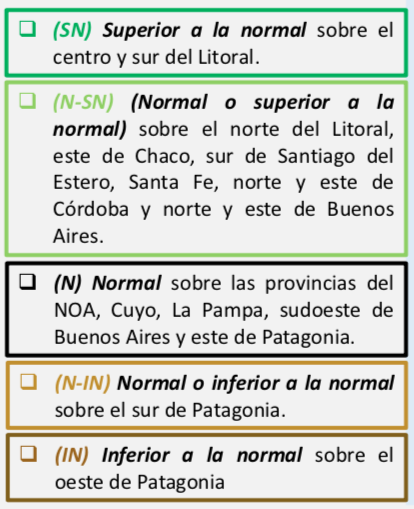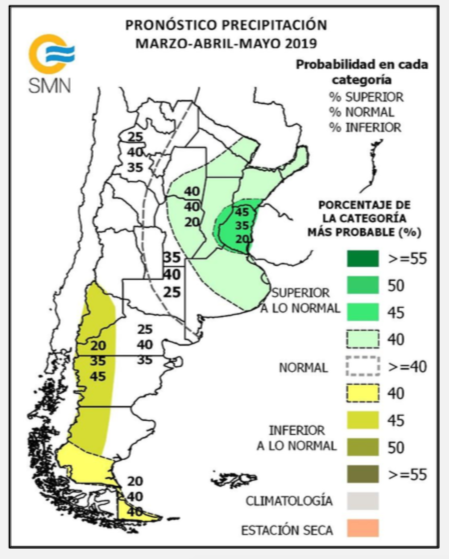 Se espera mayor chance de lluvias superiores a las normales sobre gran parte del centro- este y noreste del país. Por otro lado lluvias inferiores a las normales se esperan con mayor probabilidad hacia el oeste y sur de Patagonia. En el resto del territorio se favorecerías precipitaciones dentro del rango normal.