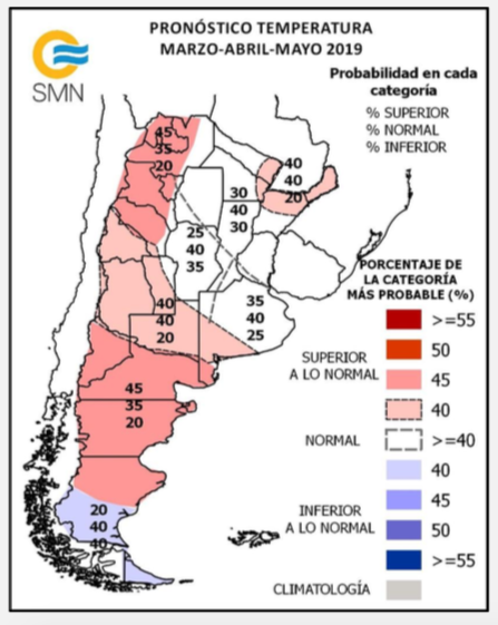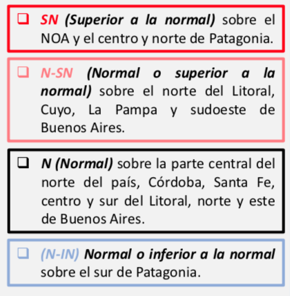 Se espera mayor chance de ocurrencia de temperaturas superiores a las normales sobre gran parte del oeste y sur del país y extremo norte del Litoral. Temperaturas inferiores a las normales se esperan con mayor probabilidad hacia el extremo sur de Patagonia. Sobre el resto del centro y norte argentino se prevé mayor probabilidad de temperaturas dentro del rango normal.
