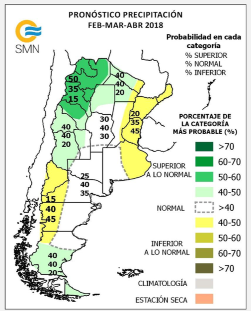Precipitación: mayor probabilidad de ocurrencia de precipitación inferior a la normal sobre las provincias del Litoral y centro-este de Buenos Aires; normal o inferior a la normal sobre La Pampa, oeste de Buenos Aires, norte y centro de Patagonia; normal o superior a la normal sobre las provincias del norte, región de Cuyo y sur de Patagonia; superior a la normal sobre las provincias del NOA; normal sobre Córdoba y oeste de Santa Fé.