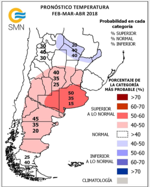 Temperatura media: mayor probabilidad de ocurrencia de temperatura superior a la normal sobre la provincia de Buenos Aires, La Pampa y sobre el norte y centro de la Patagonia; superior a la normal o normal sobre Mendoza, San Luis, Córdoba, centro-sur de Santa Fe y Entre Ríos; normal sobre las provincias del NOA, Santiago del Estero, norte de Santa fe y sur de Corrientes; normal o inferior a la normal sobre el extremo norte y noreste del país, y sur de Patagonia.