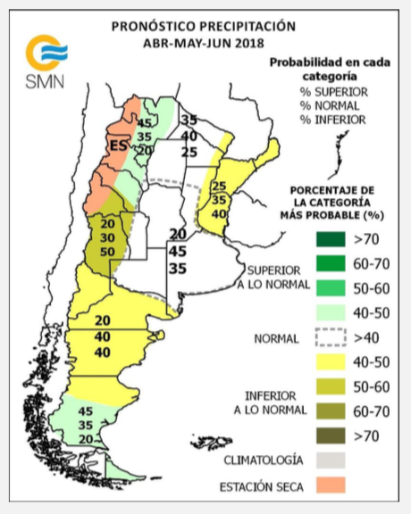 Precipitación: mayor probabilidad de ocurrencia de precipitación inferior a la normal sobre la región de Cuyo; inferior a la normal o normal sobre las provincias del Litoral; normal o inferior a la normal sobre el norte y centro de Patagonia; superior a la normal sobre el este del NOA y sur de Patagonia; normal o superior a la normal sobre el norte del país; normal sobre las provincias del centro-este del país. No se suministra pronóstico sobre el extremo oeste del NOA y oeste de San Juan por Estación Seca.