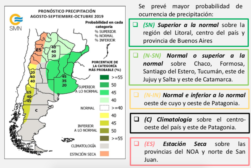 Se espera mayor chance de lluvias superiores a las normales sobre la región del Litoral, centro del país y provincia de Buenos Aires. Precipitaciones dentro del rango normal se prevé con mayor chance sobre Chaco, Formosa, Santiago del Estero, Tucumán, este de Jujuy y Salta y este de Catamarca. Mayor probabilidad de precipitaciones menores a las normales en oeste de cuyo y oeste de Patagonia. Sobre el oeste de la región del NOA y norte de Cuyo no se suministra pronóstico por ser Estación Seca. En el resto del país: Climatología.