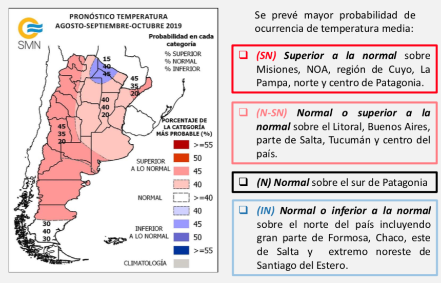 Se espera mayor chance de ocurrencia de temperaturas superiores a las normales sobre Misiones, NOA, región de Cuyo, La Pampa, norte y centro de Patagonia. Entre normal o superior a la normal sobre el Litoral, Buenos Aires, parte de Salta, Tucumán y centro del país. Sobre el norte del país, parte de Formosa, Chaco, este de Salta se prevé mayor probabilidad de temperaturas dentro del rango inferior a lo normal. Se esperan temperaturas en el rango normal sobre el sur de Patagonia.