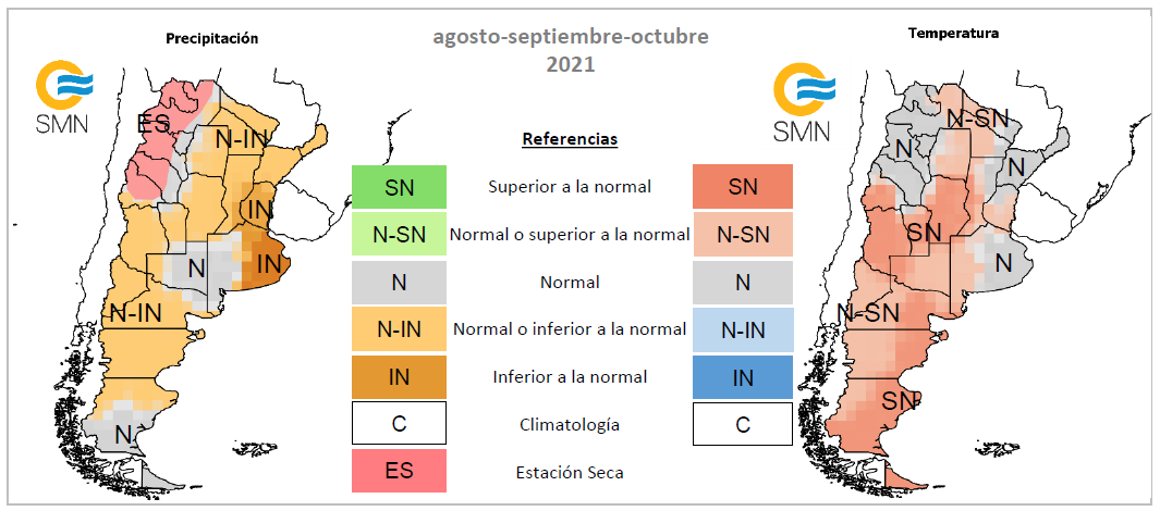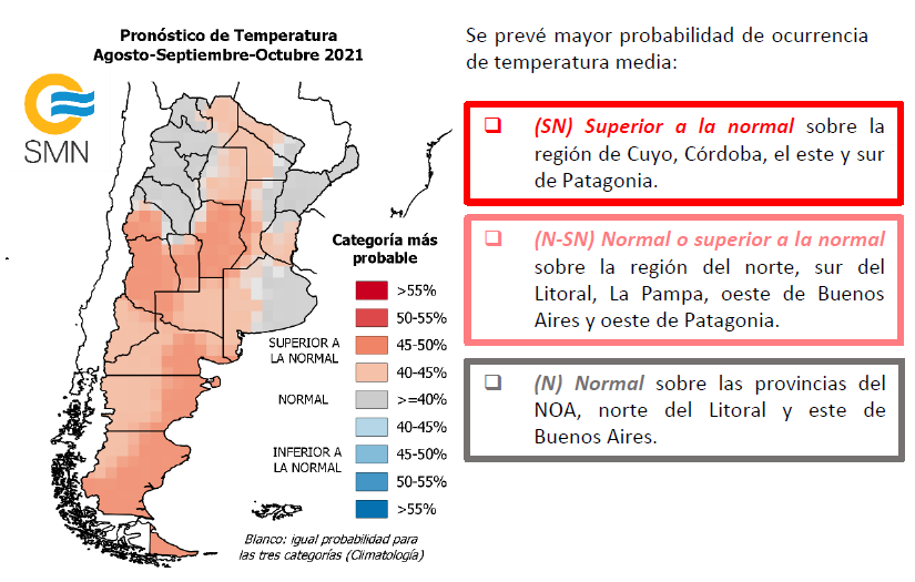 NOTA: No se descarta que la amplitud térmica sea mayor a la normal sobre el centro y norte del país, con mayor probabilidad de ocurrencia de temperaturas mínimas extremas. Se sugiere consultar los pronósticos de menor escala como así también los avisos de advertencia por bajas temperaturas.