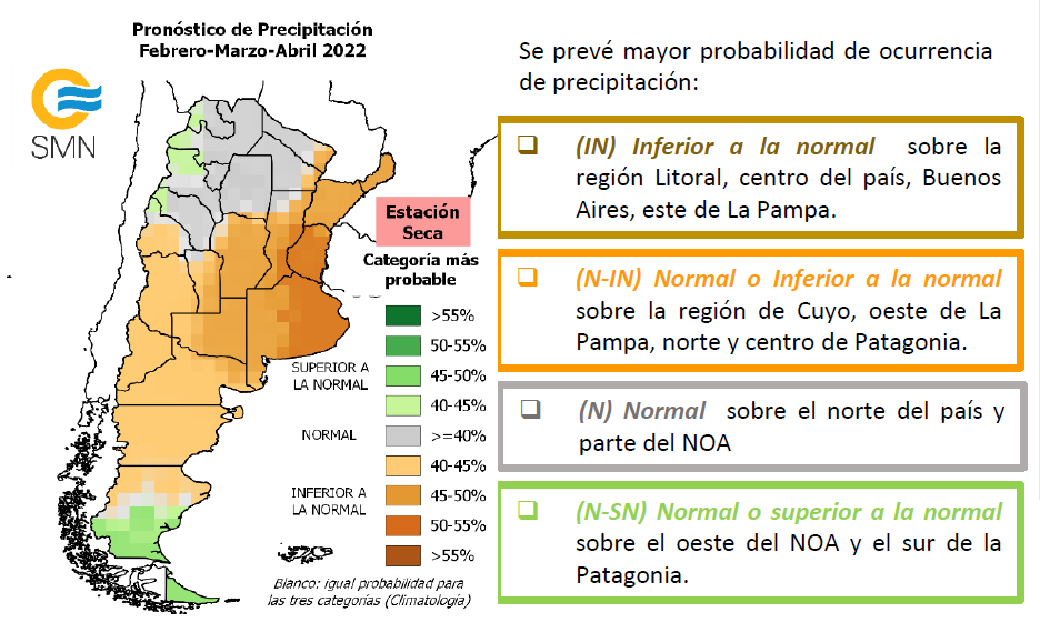 Si, por ejemplo, para una región determinada el pronóstico estacional prevé las mayores chances de precipitación en la categoría inferior, NO es indicativo que no puedan haber eventos de lluvia o inclusive que alguno de ellos puedan ser localmente intensos.