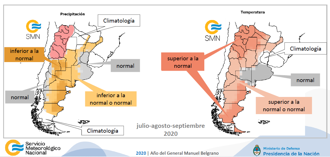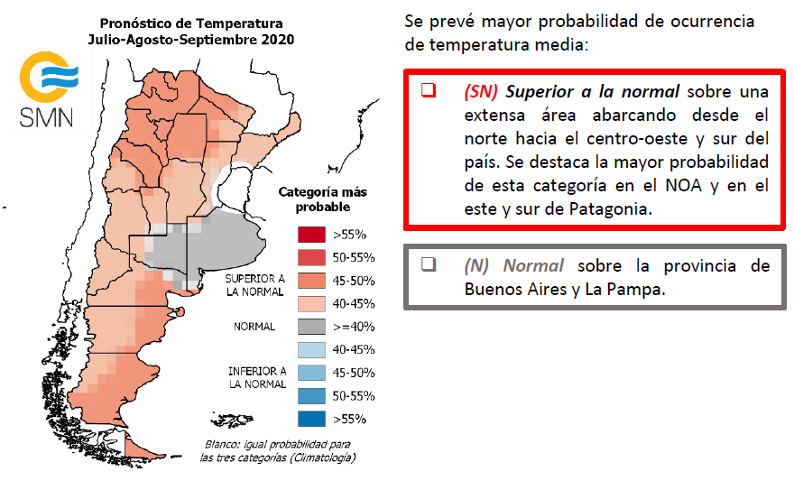 NOTA:No se descarta la ocurrencia de irrupciones de aire frío que provoquen descensos importantes de temperatura en forma temporaria. Sobre el centro este del país y norte del Litoral hay mayor probabilidad de ocurrencia de extremos fríos en las temperaturas mínimas diarias. Se sugiere mantenerse actualizado con los pronósticos en la escala diaria y semanal, y eventuales avisos por bajas temperaturas.