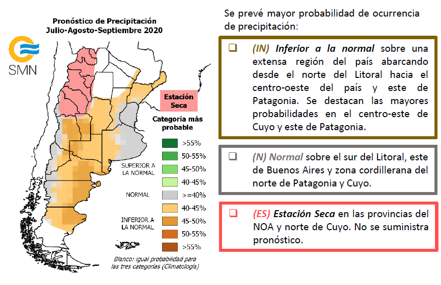 Se observan regiones donde las previsiones numéricas experimentales de los principales modelos globales de simulación del clima y modelos estadísticos indican diferencias en cuanto a las probabilidades en el pronóstico estacional. En condiciones neutras del Fenómeno El Niño Oscilación del Sur (ENOS) y en zonas sin otros forzantes, se espera que el comportamiento responda a la probabilidad del 33.3% en cada categoría (Climatología).