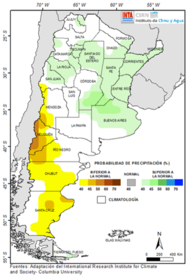 La última previsión del International Research Institute (IRI) para el trimestre Octubre—Diciembre de 2018 estima con un 40-50% de probabilidad de ocurrencia de precipitaciones superiores a las normales en el cen- tro y norte argentino. Por su parte, la probabilidad de ocurrencia de un trimestre más seco sobre Cuyo (sudoeste) y región Patagónica oscila entre los 40 y 60%.
