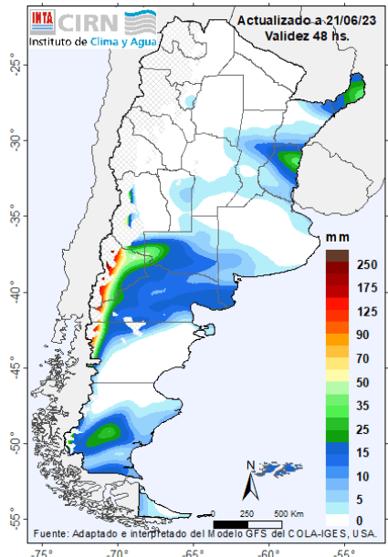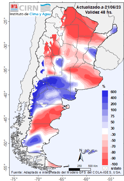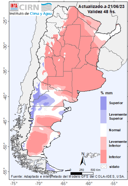 La última actualización del pronóstico climático trimestral por consenso, elaborado por el SMN e instituciones nacionales, prevé un invierno meteorológico con lluvias entre normales a superiores a las normales sobre Mendoza, centro y norte de Patagonia, sur y noreste de reg Pampeana y NEA Las probabilidades de ocurrencia se encuentran entre los 40 y 50. Las