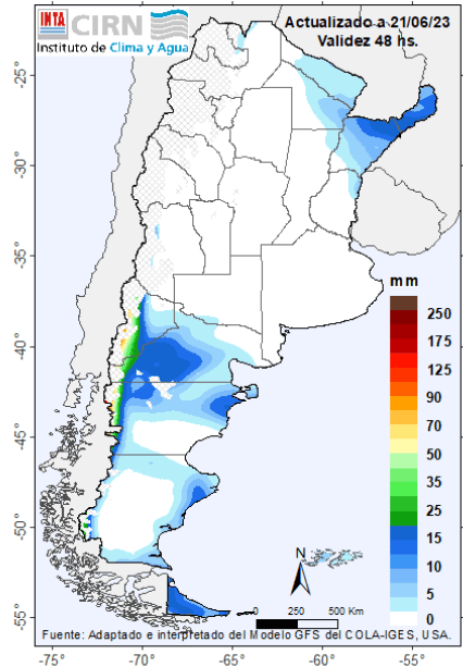 Hay probabilidad de lluvias y nevadas de variada intensidad sobre Mendoza (oeste), Neuquén, Río Negro (centro y oeste) y Chubut (oeste). Algunas podrían ser localmente intensas con importantes acumulados de agua, caída de nieve y ráfagas También se podrían registrar algunos chaparrones aislados sobre La Pampa (sur).
