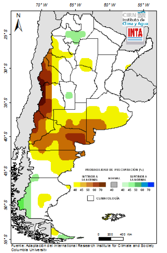 La última previsión trimestral del International Research Institute (IRI) estima, con un 40-45% de pro-babilidad, la ocurrencia de precipitaciones inferiores a las normales en gran parte del centro y oeste argentino, en áreas de Patagonia (norte) y Cuyo las chances aumentan al 45-50%. En el resto del territorio nacional el pronóstico muestra una equidad en las posibilidades de ocurrencia de los tres eventos (inferior o superior a lo normal o nor-mal) y al no haber herramientas suficientes para categorizarla corresponde a “Climatología” (Fig. 05).
