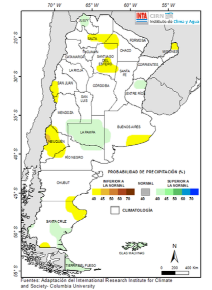 La última previsión trimestral del International Research Institute (IRI) estima una tendencia mayor- mente hacia valores normales. Existen en la previsión, áreas pequeñas y aisladas que estiman, con un 40-45% de probabilidad, la ocurrencia de precipitaciones inferiores a las normales en áreas de Misiones (norte), Salta NOA (oeste), Neuquén, Bs. As. (sur) y Santa Cruz (norte). Las áreas con probabilidad de lluvias superiores a lo normal son muy pequeñas y aisladas, y sólo podrían destacarse, según esta tendencia, La Pampa y Tierra del Fuego (Fig. 05).