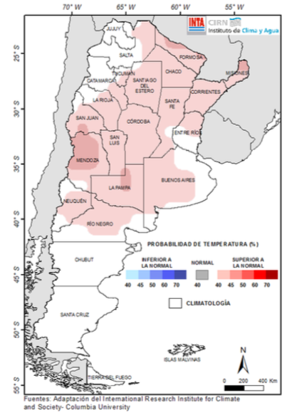 La última previsión del International Research Institute (IRI) prevé, para gran parte del centro y norte del territorio nacional, mayores chances (40-45%) de presentarse un trimestre con temperaturas medias superiores a las normales. En el resto de las provincias se muestra una equidad en la ocurrencia de los tres eventos (inferior o superior a lo normal o normal) y al no haber herramientas suficientes para categorizarla corresponde a la “Climatología” (Fig. 06).