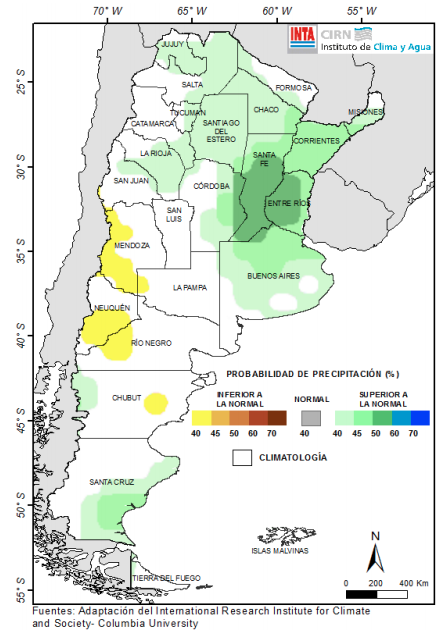 La última previsión trimestral del International Research Institute (IRI) estima, con un 40-50% de probabilidad, la ocurrencia de precipitaciones superiores a las normales en gran parte del centro, norte y sur argentino, en áreas de Santa Fe y Entre Ríos, las chances aumentan al 50-60%. Sobre áreas Cuyo (sudoeste) y Patagonia (centro y norte), se prevé con una probabilidad de 40-45% de presentarse un trimestre con lluvias inferiores a las normales. En el resto del territorio nacional el pronóstico muestra una equidad en las posibilidades de ocurrencia de los tres eventos (inferior o superior a lo normal o normal) y al no haber herramientas suficientes para categorizarla corresponde a “Climatología” (Fig. 05).