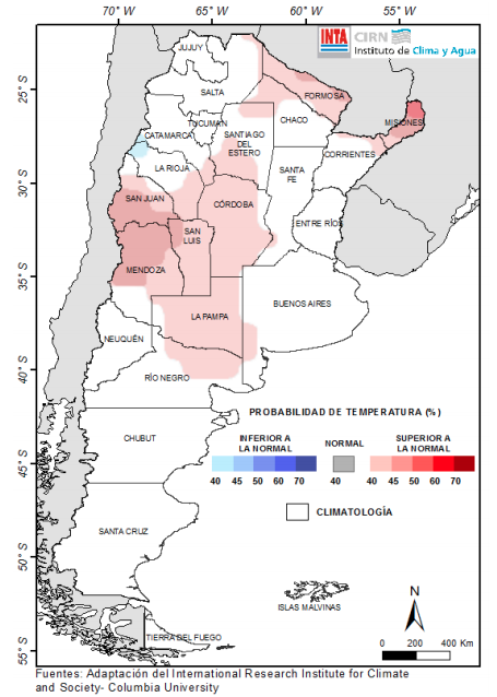La última previsión del International Research Institute (IRI) muestra, en gran parte del territorio nacional, una equidad en la ocurrencia de los tres eventos (inferior o superior a lo normal o normal) y al no haber herramientas suficientes para categorizarla corresponde a la “Climatología”. Sin embargo, sobre Misiones, Formosa, Chaco (oeste), San Juan, Mendoza, San Luis, Córdoba, Santiago del Estero, La Pampa y Río Negro (norte) las chances de presentarse un trimestre con temperaturas medias superiores a las normales son de 40-50% ( Fig. 06).