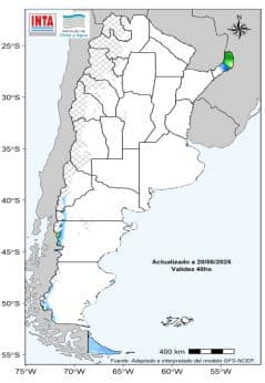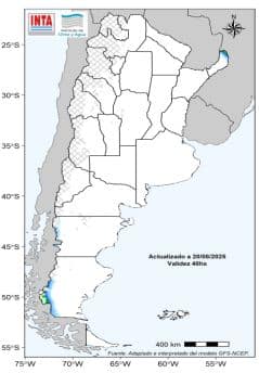 Mientras que sobre áreas del Litoral y oeste de Patagonia las mayores probabilidades son de lluvias entre normales a deficitarias.