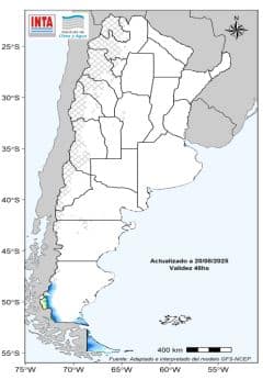 Heladas agrometeorológicas (menores a 3°C) en el norte y heladas débiles en el centro del país (menores a -3 °C). Heladas moderadas a intensas (menores a -6 °C) en la Patagonia.