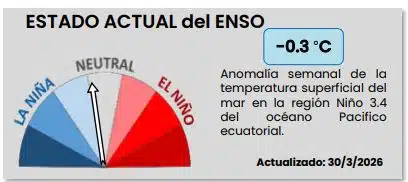 El fenómeno ENSO se encuentra en un proceso de transición hacia condiciones neutrales durante este trimestre. Estas condiciones neutrales presentan mayores probabilidades de persistir a lo largo del otoño e invierno.