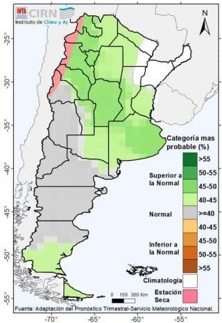 Se asigna una mayor probabilidad de lluvias acumuladas del trimestre en el rango superior a lo normal en el centro, norte y este del país (color verde). Las probabilidades de un trimestre más húmedo son mayores en el centro y este de Buenos Aires, sur de Entre Ríos, Córdoba y noreste argentino. En el centro y norte de Patagonia y sur de Cuyo (color gris) son mayores las probabilidades de transitar un trimestre con lluvias normales para la época.