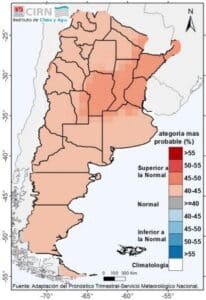 Mayores probabilidades de temperaturas medias del trimestre entre normales a más cálidos que lo habitual en todo el territorio nacional (color gris y rojos). Las probabilidades de ocurrencia de un trimestre más cálido son mayores al 50% en las provincias del Litoral y Córdoba (color rojo oscuro).