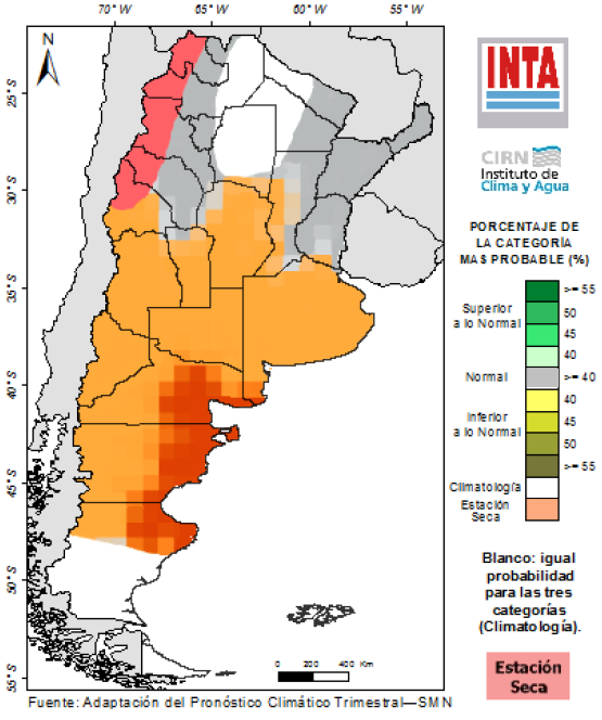 La última previsión trimestral del Foro Interinstitucional, que se reúne en el Servicio Meteorológico Na-cional (SMN), indica: un trimestre con probabilidad de lluvias por debajo de lo normal sobre las regiones Pampea-na, Cuyo (sur) y Patagonia (centro y norte). Las chances de un trimestre con lluvias en el rango normal son mayo-res en las provincias del NEA y NOA (este). En las porciones restantes del territorio nacional se prevé una equidad entre las tres categorías “climatología”, exceptuando NOA (oeste), que transita aún su estación seca durante este trimestre (Fig. 05).