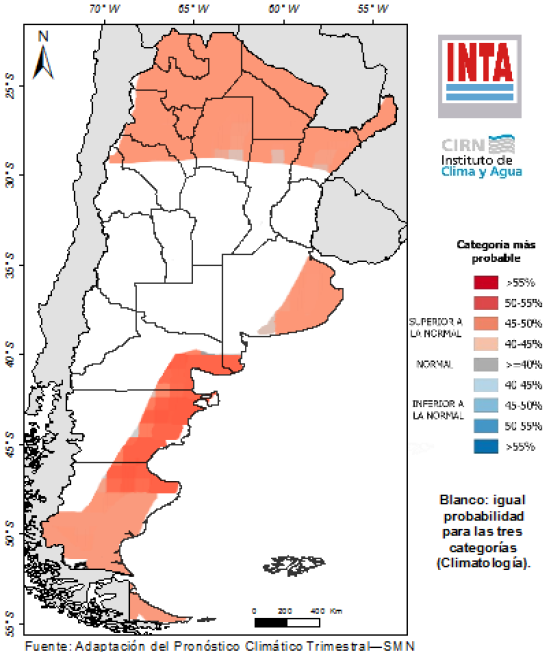 La última previsión del Foro Interinstitucional, que se reúne en el Servicio Meteorológico Nacional (SMN), indica: mayor probabilidad de temperaturas medias trimestrales por encima de lo normal en el norte del país, Buenos Aires (este) y Patagonia (este y sur). En el resto del territorio existe una equidad entre las tres cate-gorías y corresponde a la “Climatología” (Fig. 06).