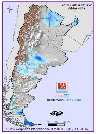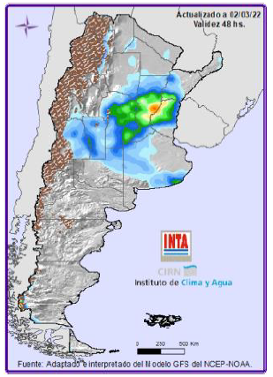 Precipitaciones: Lluvias y tormentas significativas sobre el norte de región Pampeana y norte entre el viernes y el martes, concentrándose las lluvias mas importantes entre los días domingo y martes. Temperaturas: Altas tem-peraturas sobre el norte del país. Para más información local consultar: http://siga.inta.gob.ar/#/forecast