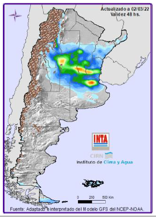 Para el Jueves 03, se registraría abundante nubosidad con tiempo inestable sobre el norte del país y probabilidad de algunas lluvias y tormentas aisladas sobre Formosa, Chaco y Misiones; desde Patagonia (norte) comenzaría a desplazarse un frente frío provocando algunas lluvias y tormentas sobre Neuquén, Río Negro y La Pampa. A partir del Viernes 04 y hasta el Lunes 07, sobre la porción centro se prevén condiciones de tiempo inestable con nubosidad variable y probabilidad de lluvias y tormentas de variada intensidad; algunas podrían ser localmente intensas con abundante caída de agua, ráfagas y ocasional caída de granizo sobre Córdoba, Santa Fe, Entre Ríos y Bs. As. (noreste) especialmente el Domingo 06. Hacia el Martes 08, el sistema de mal tiempo afectaría las provincias del norte de territorio junto con cielo nuboso, vientos que rotarán al sector sur y probabilidad de lluvias y tormentas de variada intensidad sobre Catamarca, reg. Pampeana (norte), NOA y NEA; algunas podrían ser localmente intensas sobre Córdoba, Santa Fe, Entre Ríos, Tucumán y Salta.