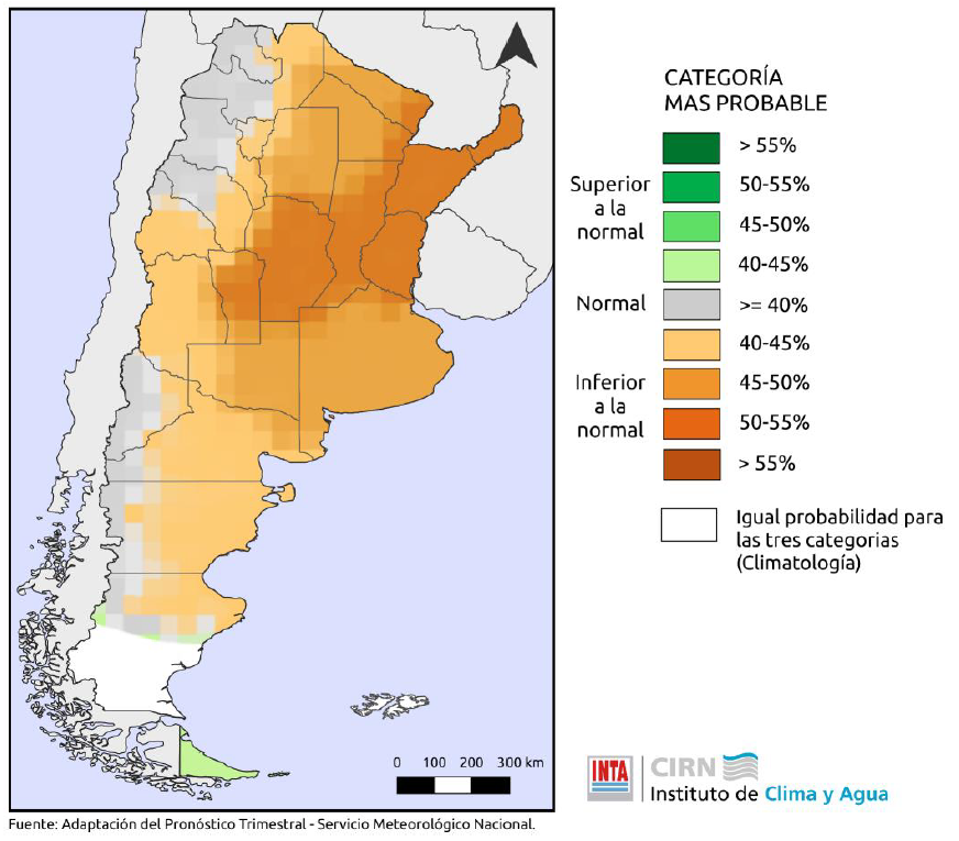 La última previsión trimestral del Foro Interinstitucional—Servicio Meteorológico Nacional (SMN), prevé que continúen las condiciones deficitarias de lluvias sobre casi todo el país. Las chances hacia el déficit son mayores sobre las provincias de San Luis, Córdoba y el Litoral. Sobre el NOA (oeste) y Patagonia (oeste) existe mayor probabilidad de observar un trimestre con lluvias normales (Fig. 05).