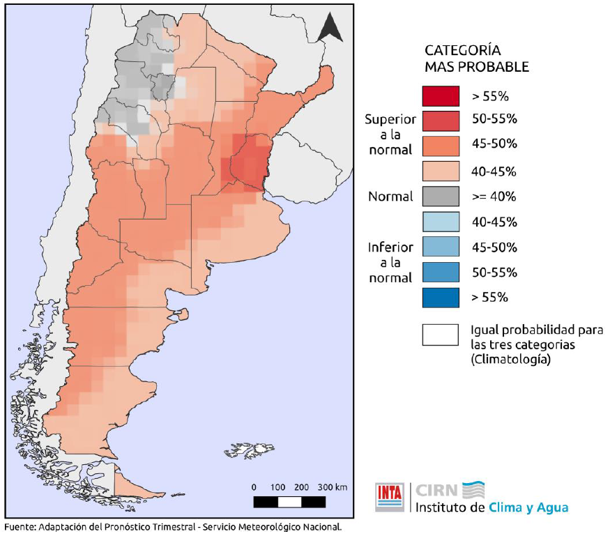 En cuanto a las temperaturas del trimestre en curso, la última previsión del Foro Interinstitucional Servicio Meteorológico Nacional (SMN), indica: mayor probabilidad de temperaturas medias trimestrales por encima de lo normal en gran parte del territorio nacional. Se prevé mayor probabilidad de temperaturas medias del trimestre normales sobre el NOA (Fig. 06).