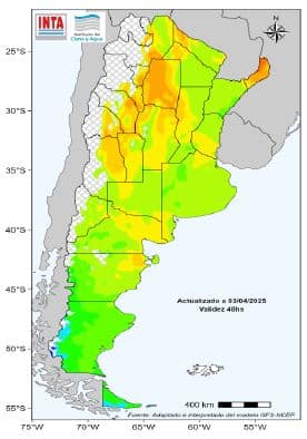 El viernes 04 continuaría el ingreso de un pulso de aire frío sobre el sur y centro del territorio. Habría bajas temperaturas hasta el sábado 05. Entre el lunes 07 y el martes 08 hay probabilidad de lluvias y tormentas de variada intensidad sobre el noreste del país. Algunas podrían ser localmente intensas con ráfagas y ocasional caída de granizo sobre