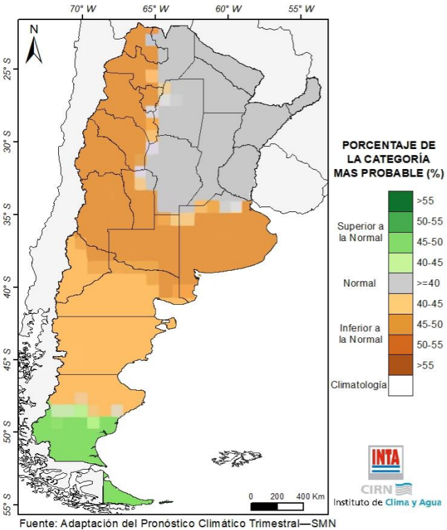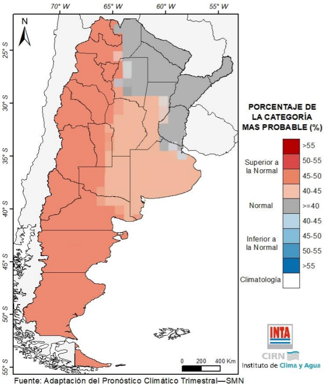 La última previsión del Foro Interinstitucional, que se reúne en el Servicio Meteorológico Nacional (SMN), indica: mayor probabilidad de temperaturas medias trimestrales por encima de lo normal en gran parte del territorio nacional, siendo mayores las chances de un período cálido sobre el oeste y sur argentino. En el noreste del país se prevé un trimestre con temperaturas normales (Fig. 06).