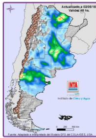 - Precipitaciones de diferentes intensidades en todo el territorio Nacional. Los mayores acumulados se darían en las provincias de las regiones Pampeana y NEA, sobre Corrientes, Entre Ríos, Santa Fe, centro-este de Chaco y de Formosa, este de Santiago del Estero y de Córdoba, centro-este de Buenos Aires.